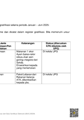 Berikut ini rekapitulasi laporan penerimaan dan penolakan gratifikasi selama periode Januari – Juni 2025: